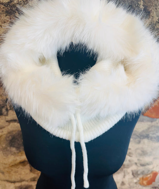 “Claudia “ winter white faux fur vegan trim hood snood