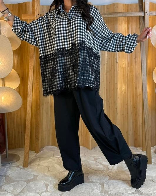 “Naia “ monochrome Italian brush cotton plaid lace overlay shirt