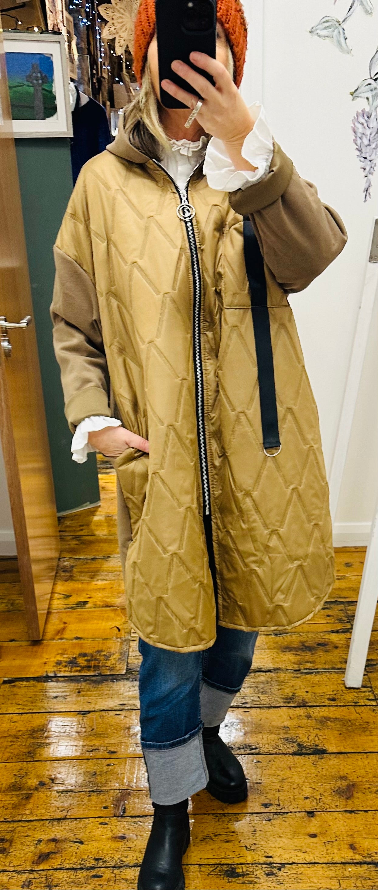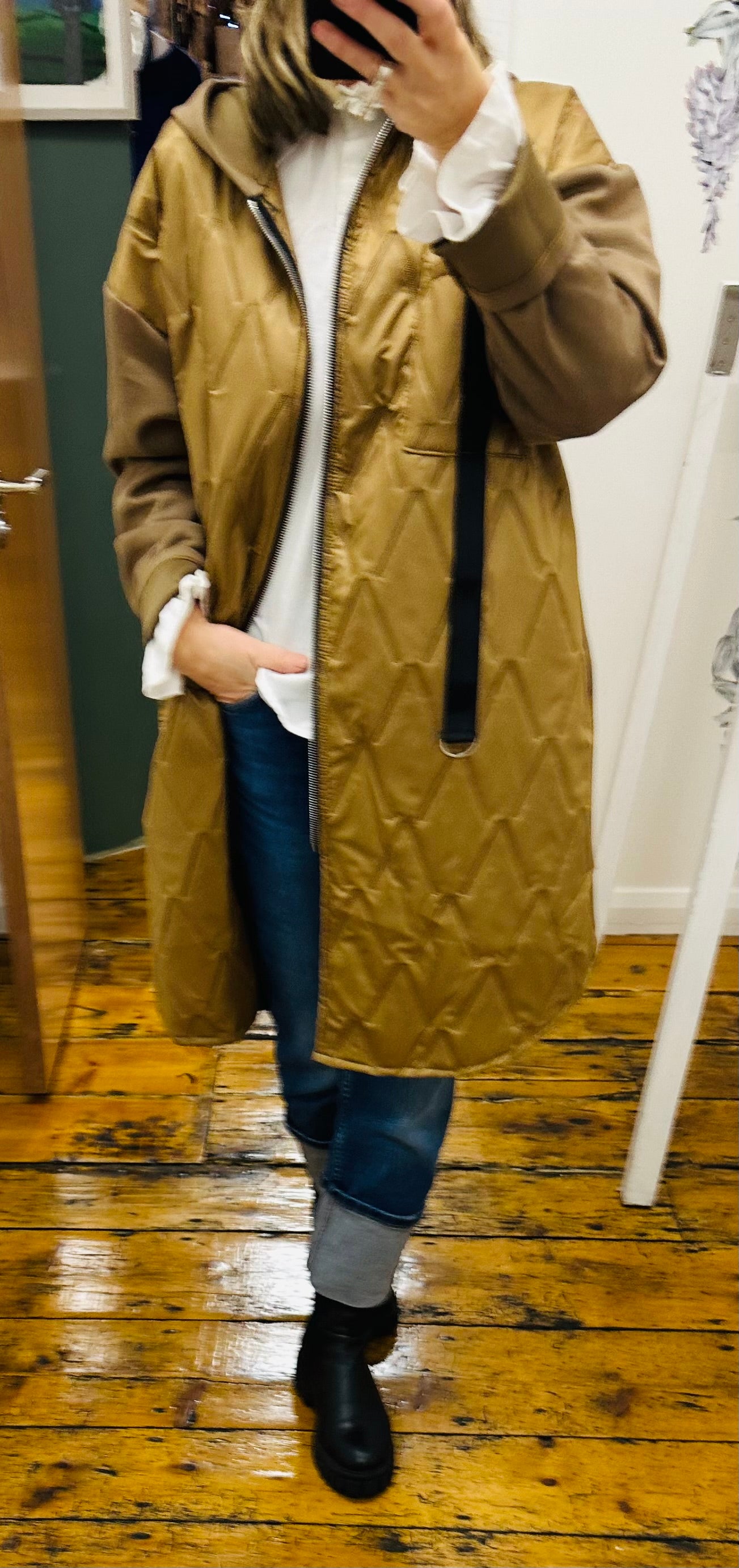 Italian hooded casual jacket with padded effect front paneling and jersey scuba back and sleeve contrasting detail ..perfect for a layered look when you don’t want a big bulky coat