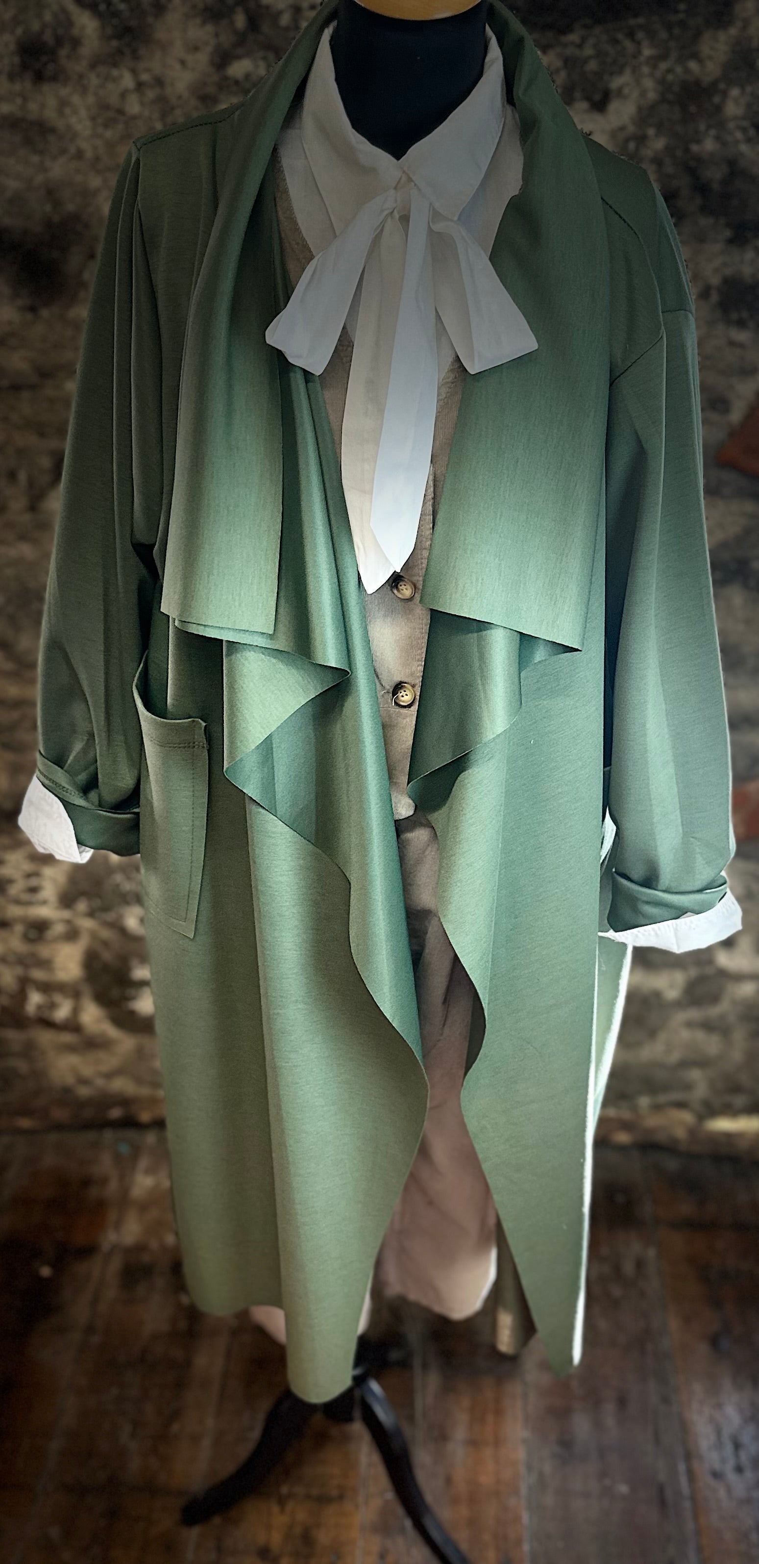 THE JACKET IN THE IMAGE IS A CHIC, OPEN-FRONT DRAPE JACKET IN CLASSIC GREEN. IT FEATURES A FLOWING WATERFALL-STYLE COLLAR THAT CREATES SOFT MOVEMENT AND A FLATTERING SILHOUETTE. THE RELAXED, OVERSIZED FIT MAKES IT VERSATILE FOR LAYERING, WHILE THE LONG LENGTH ADDS SOPHISTICATION AND COVERAGE. IT ALSO INCLUDES PRACTICAL SIDE POCKETS, BLENDING STYLE WITH FUNCTIONALITY.
