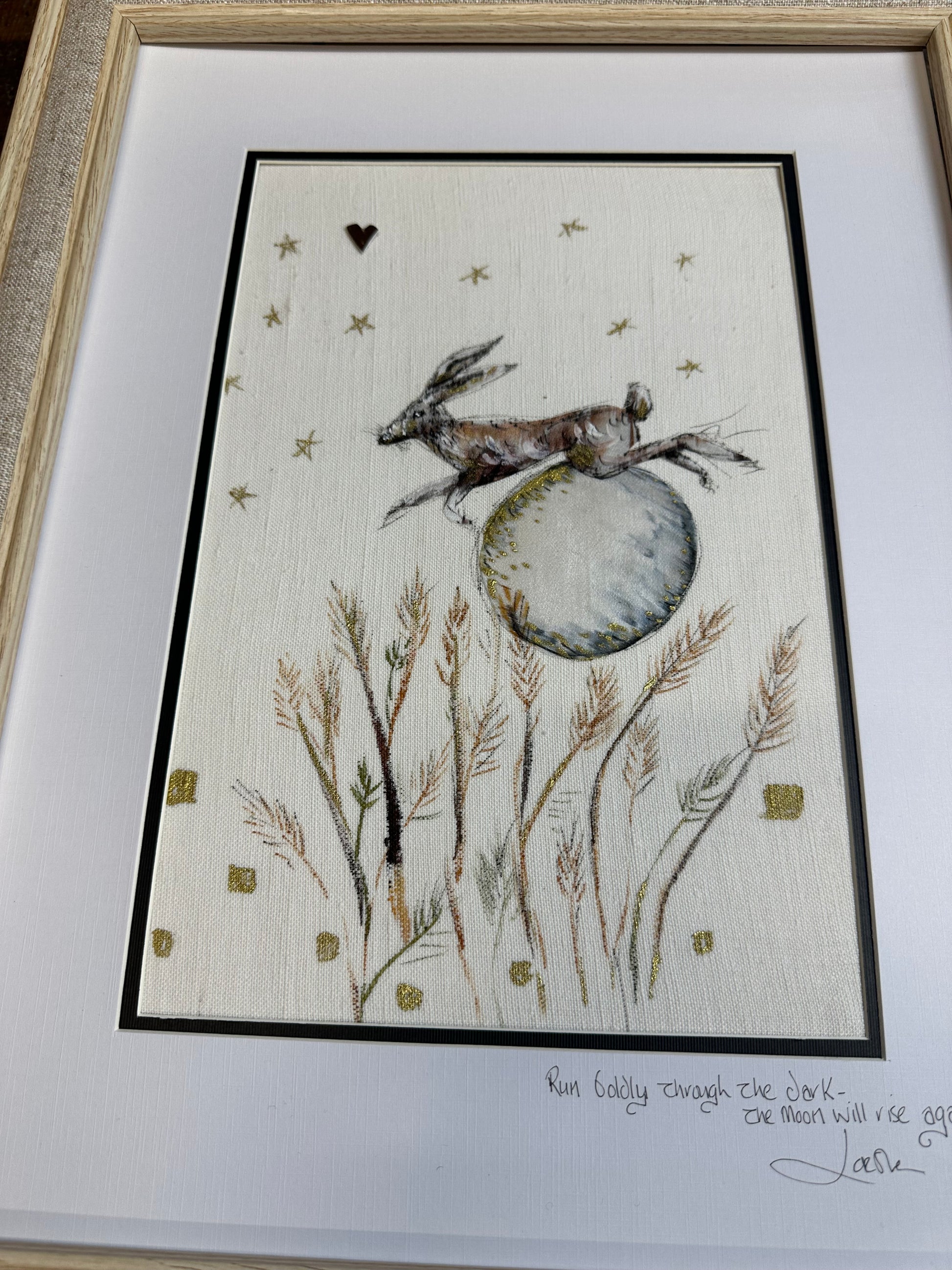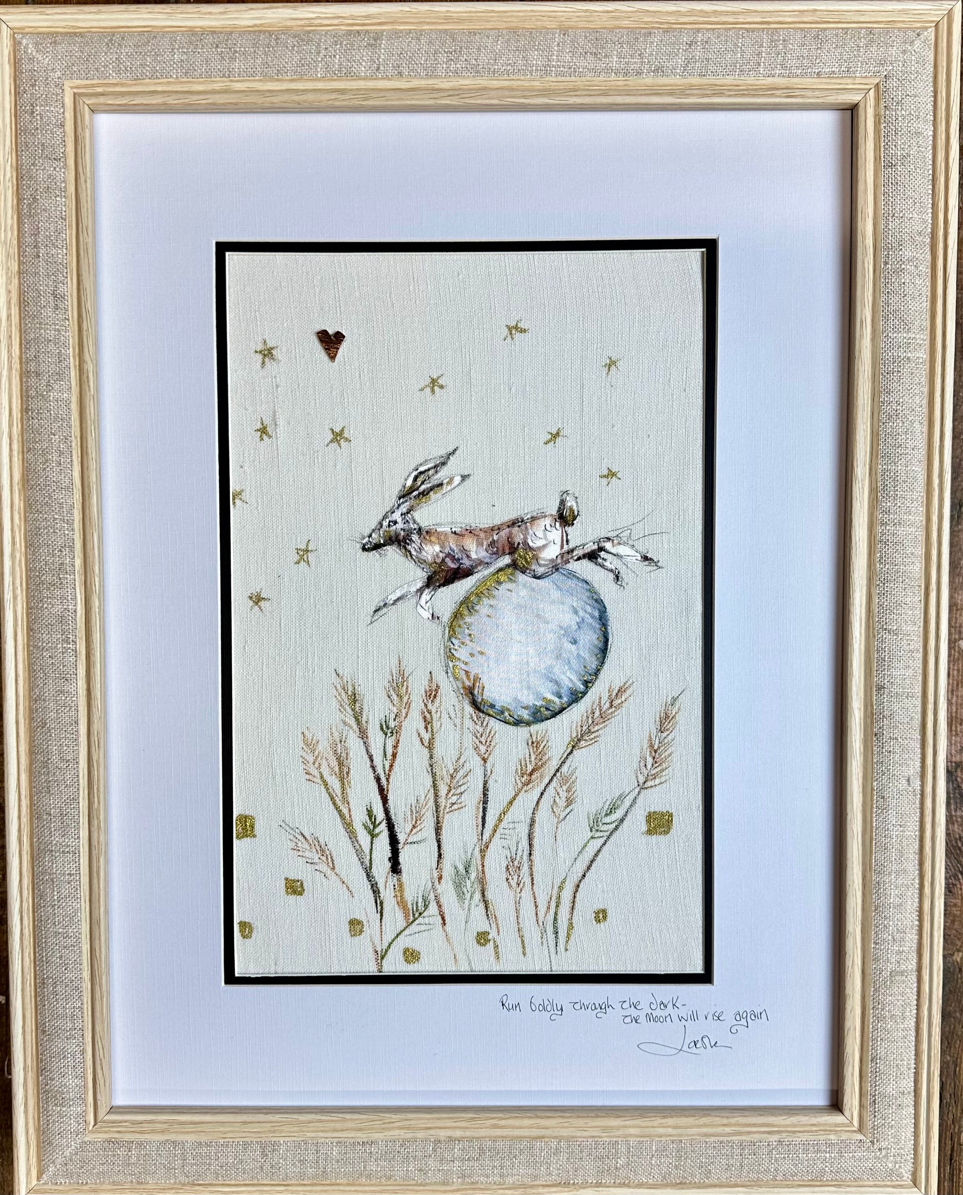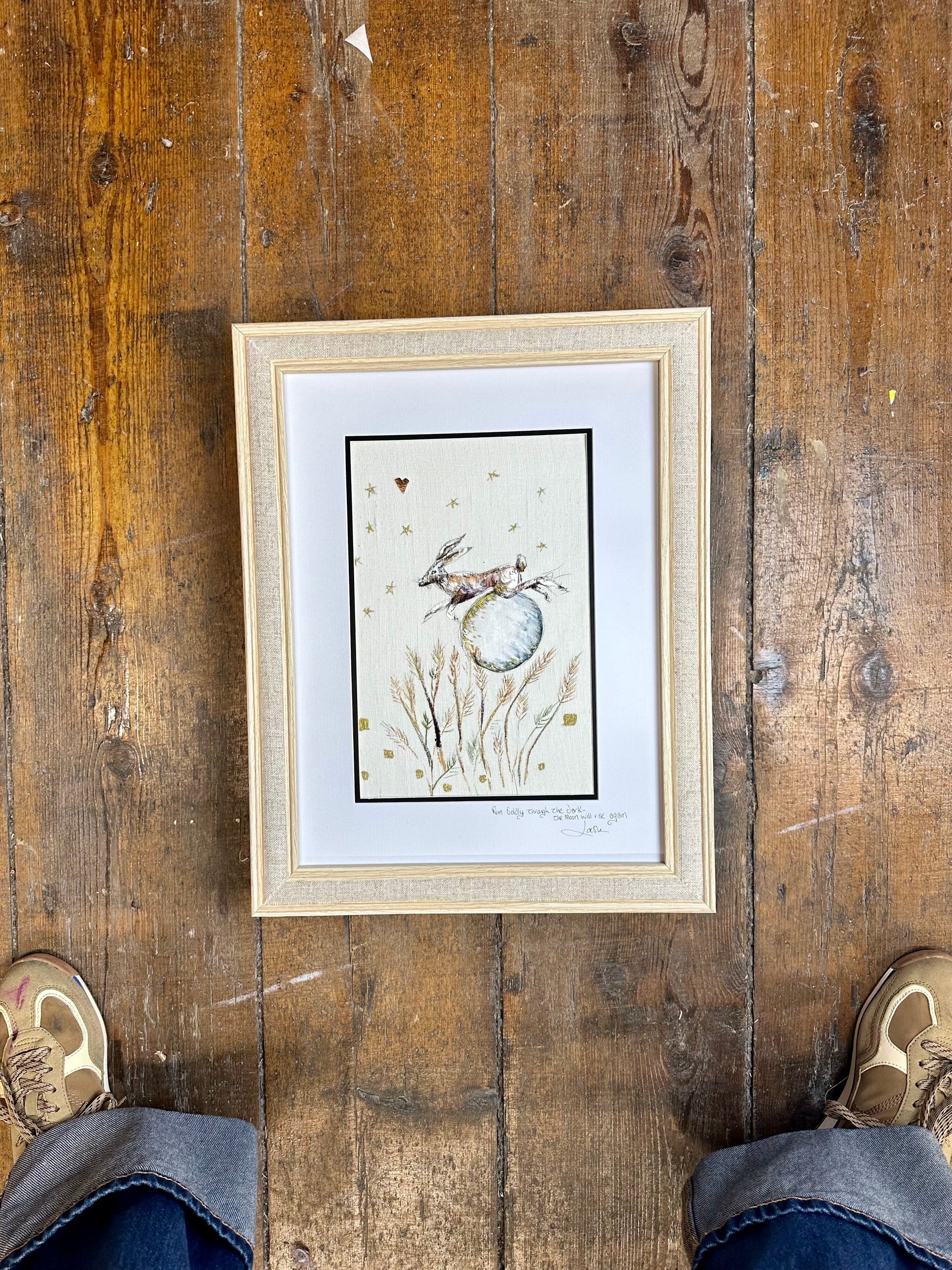 framed in a natural linen frame finished size