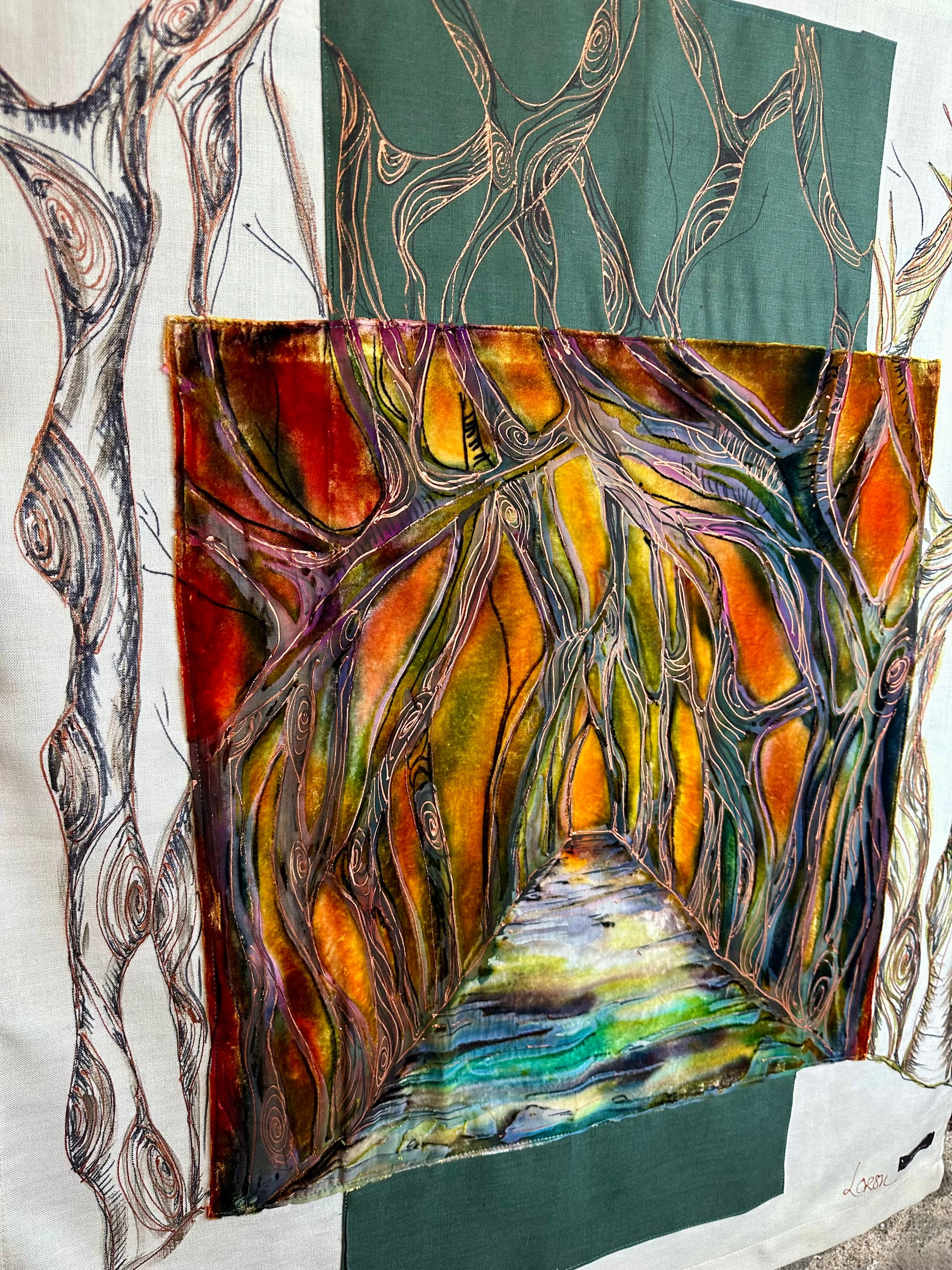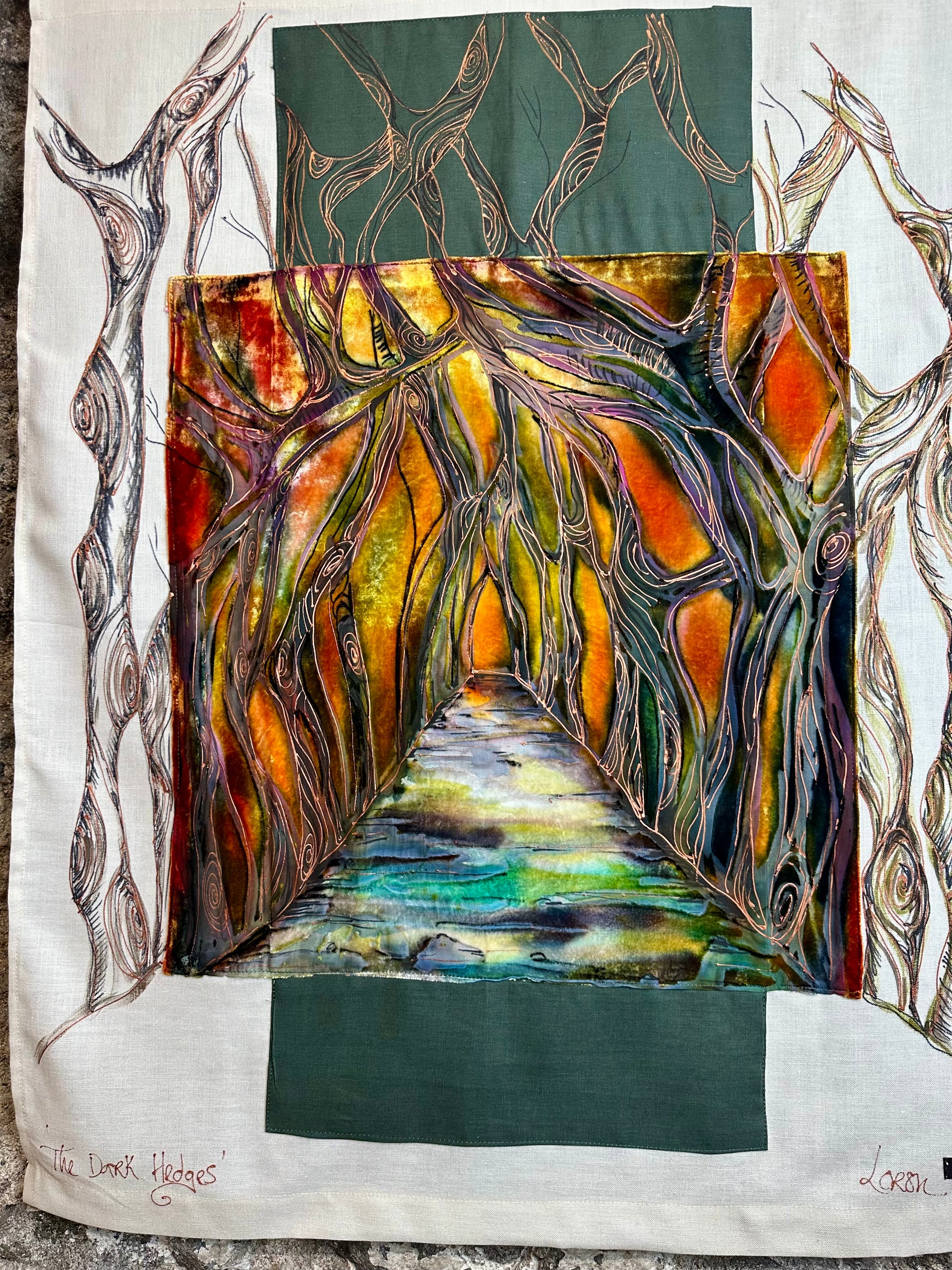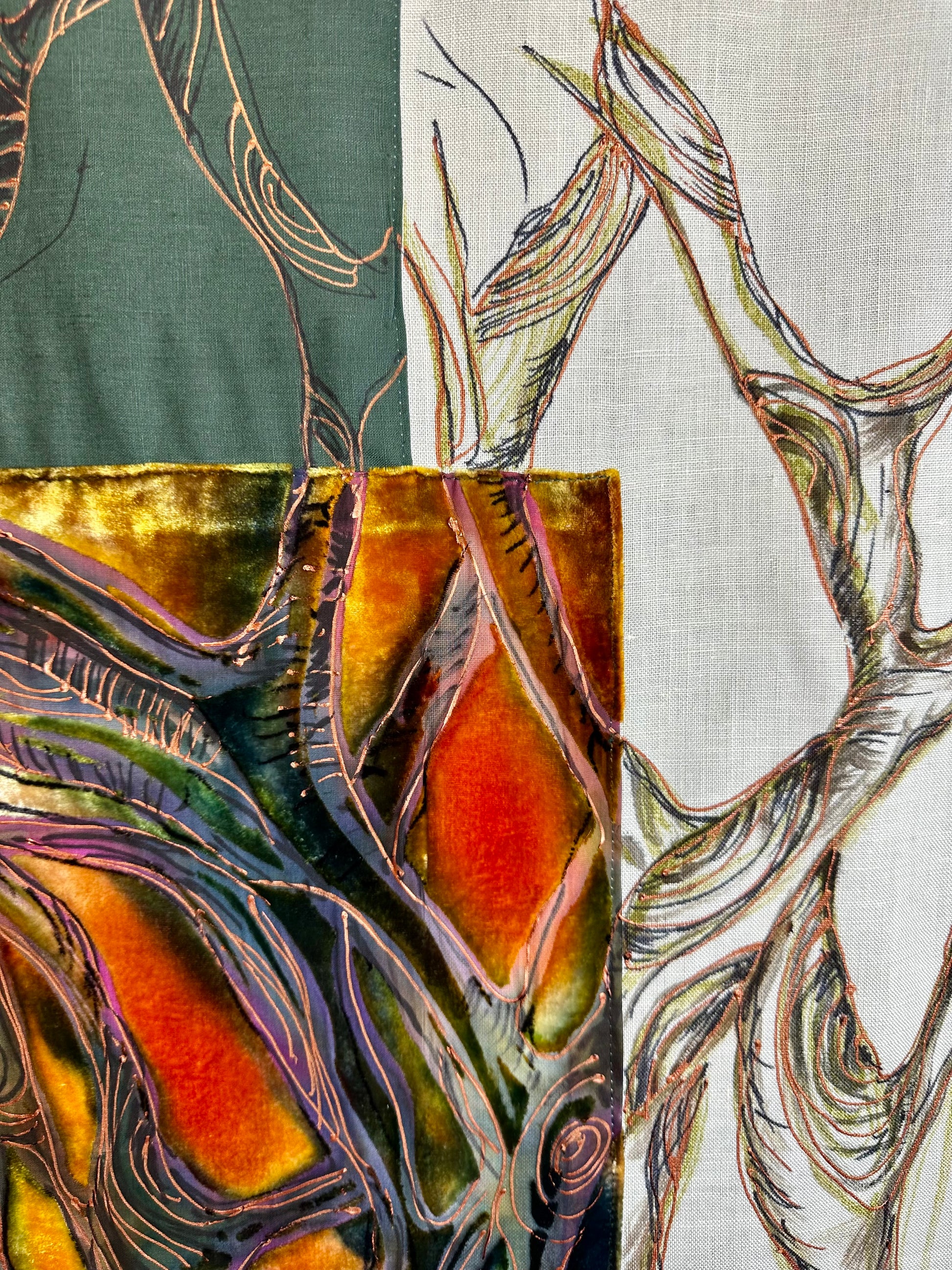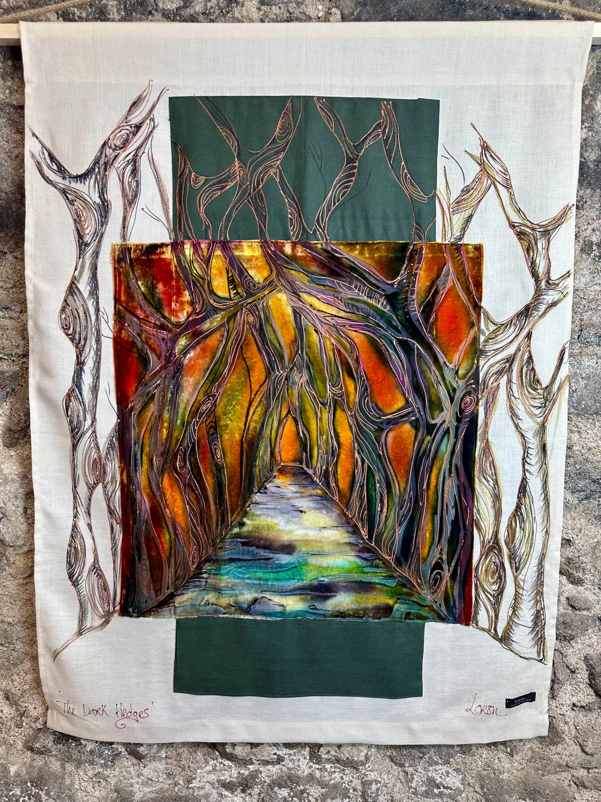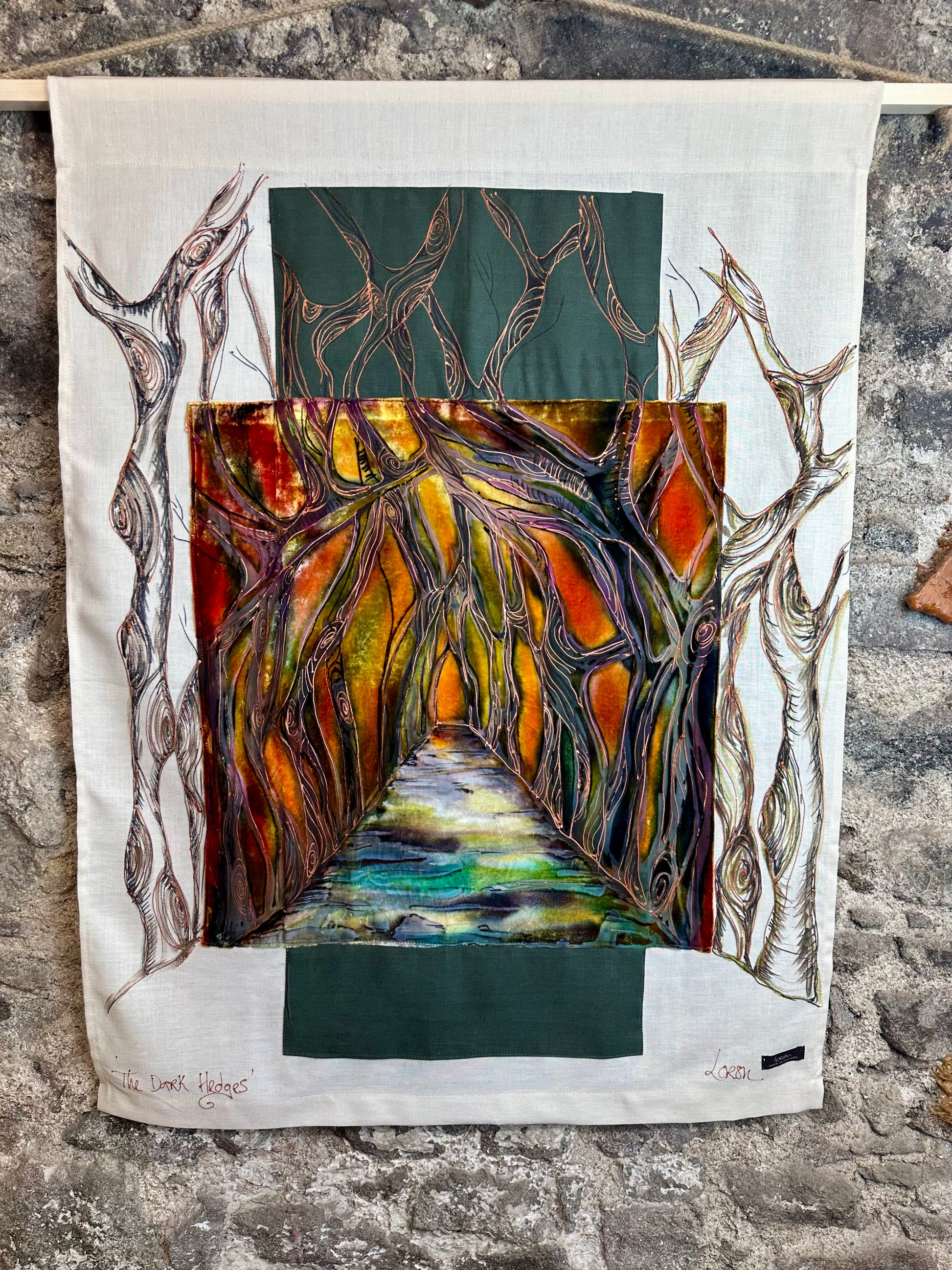 lorsha Handpainted Devore velvet on Irish linen poled wallhanging collection