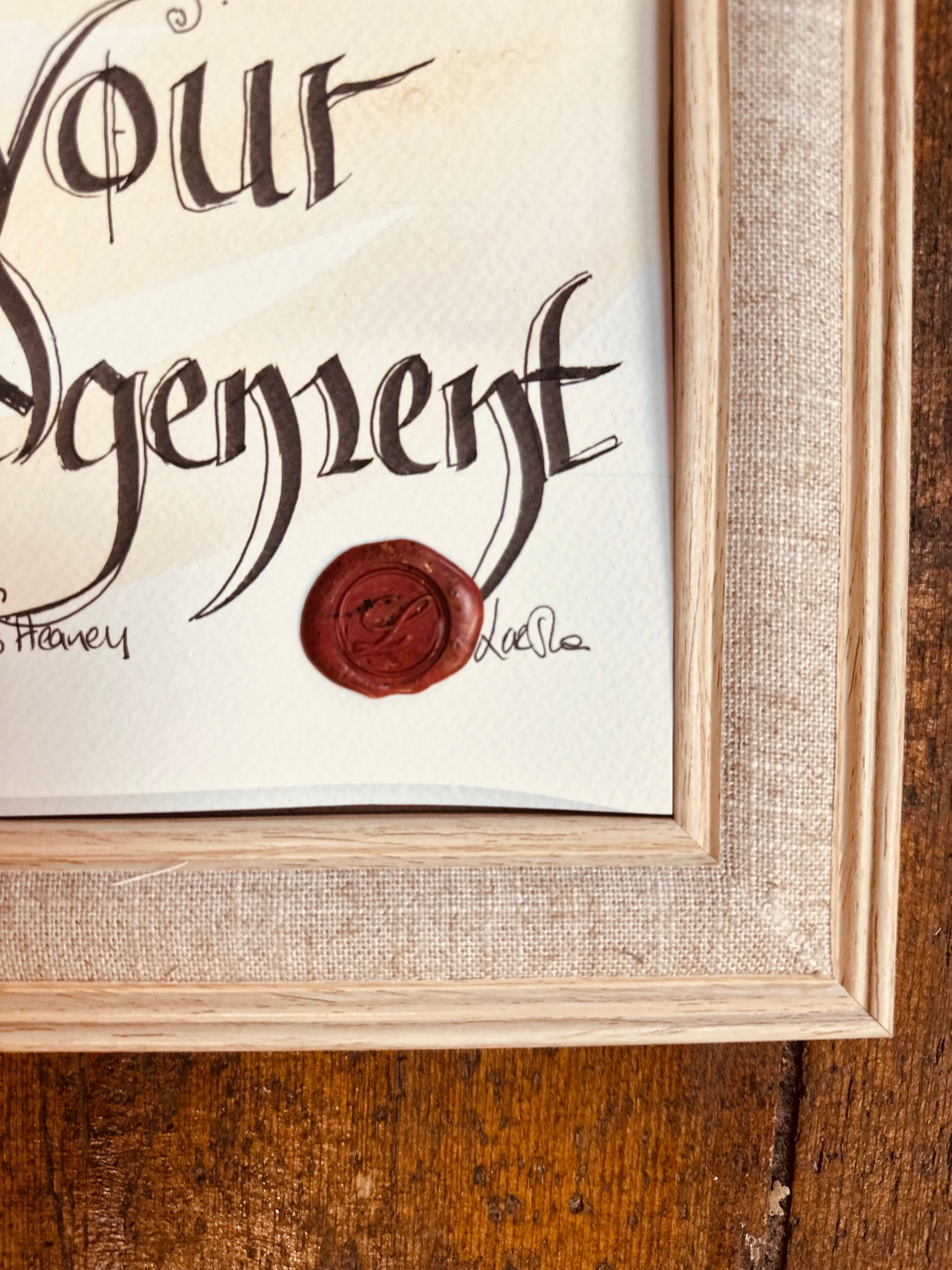 Lorshadesign hand written wax sealed calligraphies framed in a natural linen frame